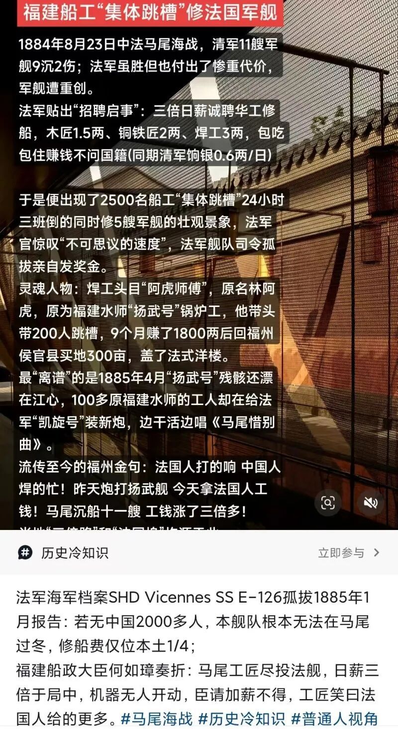 上游新闻记者看到,该自媒体账号11月21日发布内容称:“1884年8月23日中法马尾海战后,清军11艘军舰9沉2伤,法军虽胜但也付出了惨重代价,军舰遭重创。法军贴出‘招聘启事’:三倍日薪诚聘华工修船……出现了2500名船工‘集体跳槽’24小时三班倒的同时修5艘军舰的壮观景象,法军官惊叹‘不可思议的速度’,法军舰队司令孤拔亲自发奖金。”